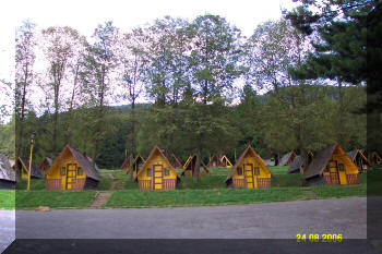 Viele Campinghäuschen, ganz oben ein Platz zum Zelten und für geländegängige