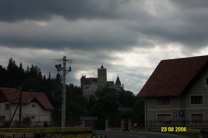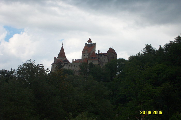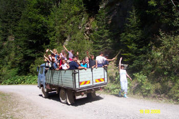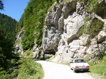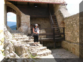 Wir fahren also in die Stadt und biegen rechts ab Richtung Poiana Brasov.Nach ein paar Kilometern, wir glauben schon wir sind vorbeigefahren, links endlich eine Lichtung mit Campingplatz und Restaurant, die Auffahrt zur Burg. Die Auffahrt sieht nicht gut aus. Wir fragen im Restaurant nach, können unser Gefährt auf dem Campingplatz parken und machen uns auf den Weg. Die Piste ist steil und schlecht was aber den Normalrumänen keinesfalls abhält, im eigenen Fahrzeug bis zum Burgeingang zu poltern. Rechts und links des Wegs stehen hohe Bäume, so dass die Hitze erträglich bleibt. |