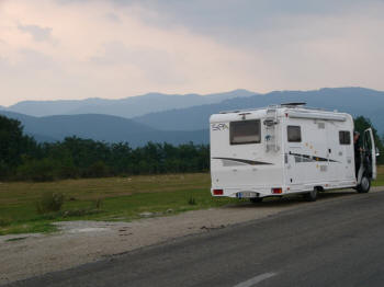 schlafen wollen. Der Parkplatz kommt nicht in Frage; er ist so schräg, soviel Keile können wir nicht beibringen, wie wir brauchen würden. Sonst ist kein Platz vorhanden. Also weiter, d. h. zurück bis nach Berca, und dann mal sehen. |