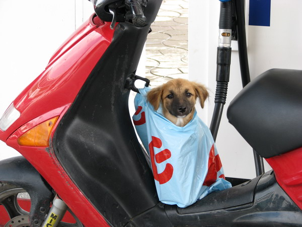 | Zunächst müssen wir tanken. An der Tankstelle sehen wir einen Rollerfahrer, der seinen kranken Hund zum Arzt bringt. |